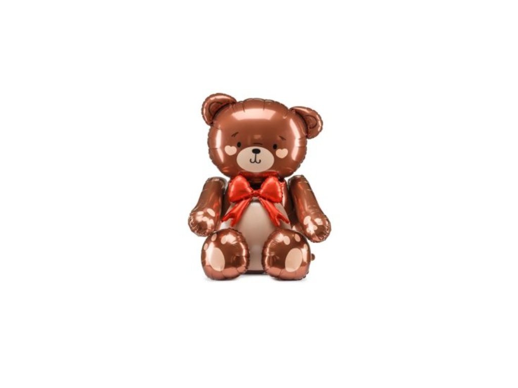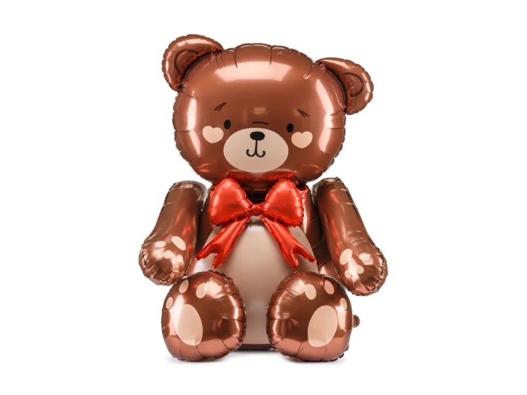 Luxusní fóliový balónek ve tvaru sedícího medvídka s mašlí, 3D efekt, hnědé odstíny, propracované detaily.