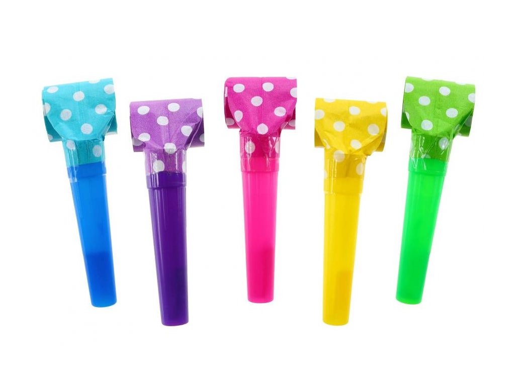 ✅ Papírové frkačky v pěti různých barvách s puntíky.