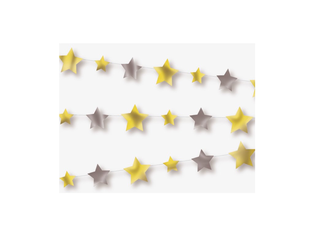Girlanda tvořena z papírových zlatých a stříbrných hvězd, délka cca 270cm, dvě různé velikosti hvězdiček (6cm a 4cm), oboustranné lesklé, připevněné na stříbrném provázku.