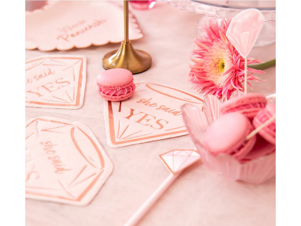 Papírové ubrousky ve tvaru diamantu s růžově zlatým nápisem "She said YES"