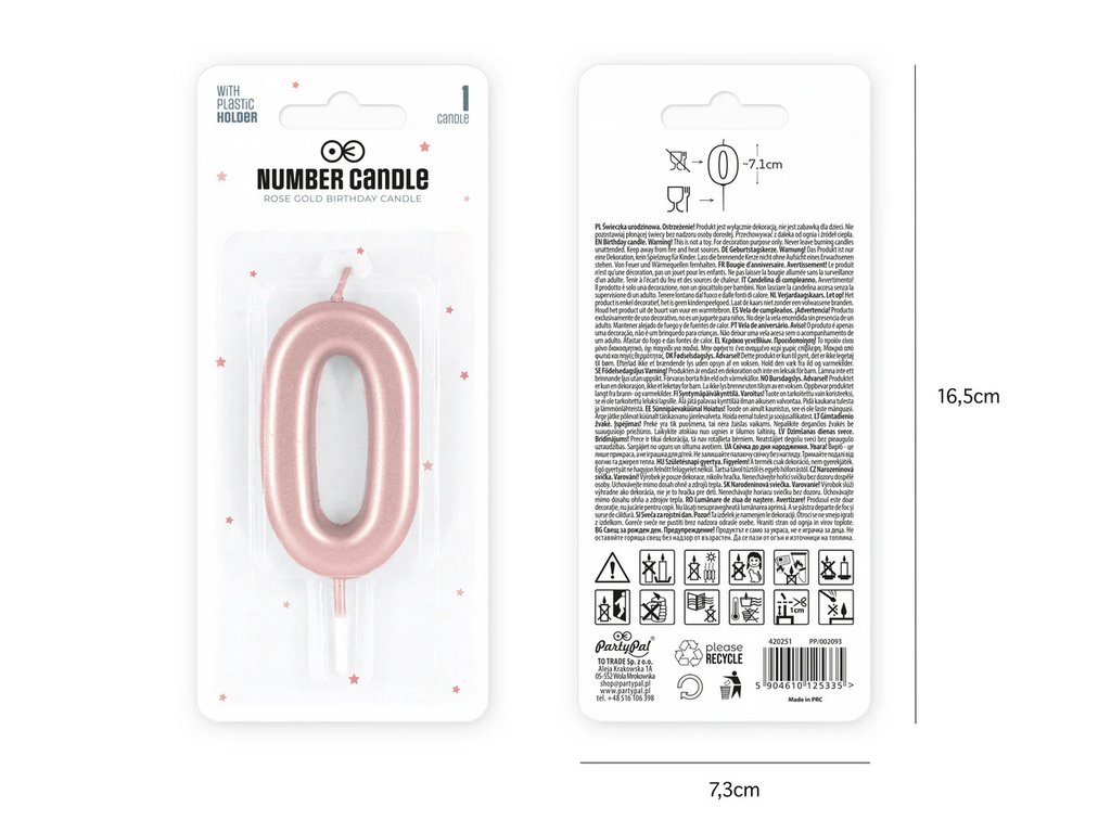 Svíčka ve tvaru čísla "0" v jemné růžově zlaté barvě. Celková výška cca 10cm, výška samotného čísla je 7,1cm, plastový zápich má cca 2,5cm. Šířka čísla cca 4cm.