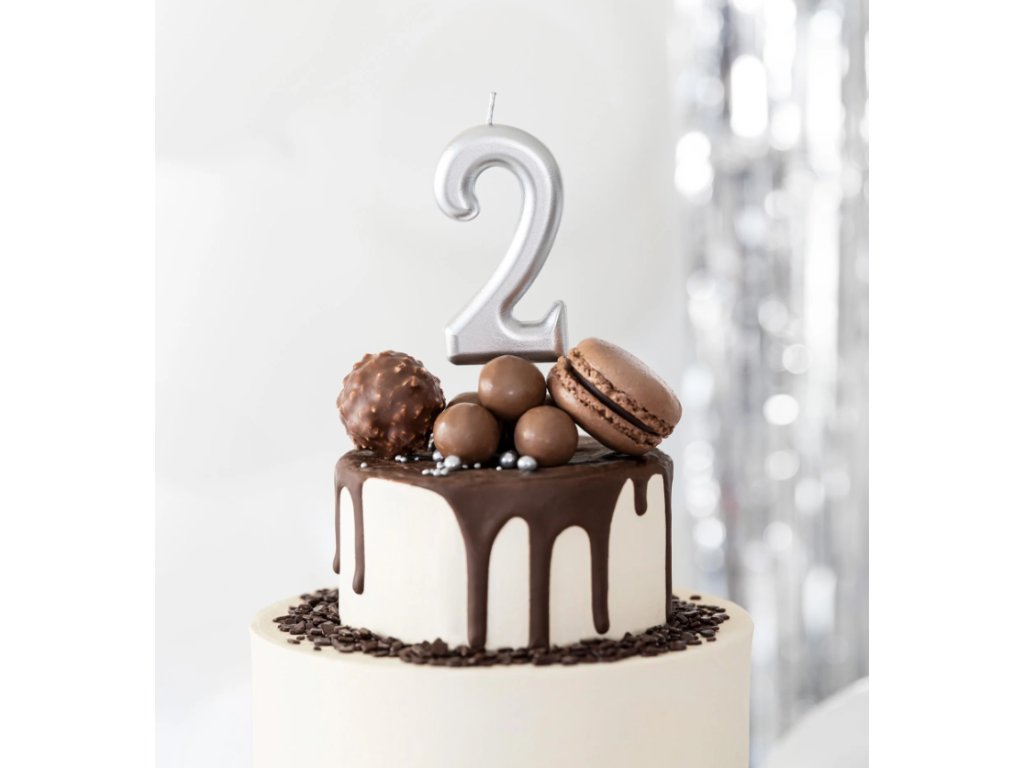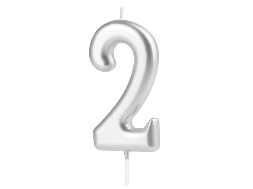 Elegantní narozeninová svíčka ve tvaru čísla 2 v jemném stříbrném odstínu dodá vaší oslavě šmrnc a slavnostní nádech.