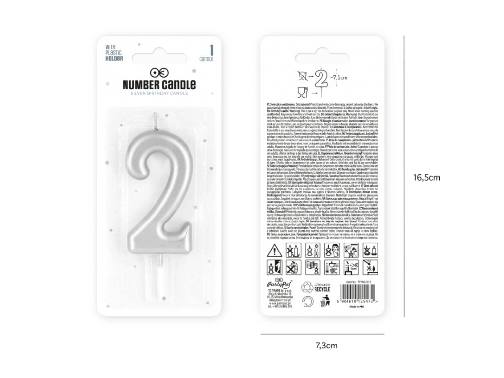 Svíčka ve tvaru čísla "2" ve stříbrné barvě. Celková výška cca 10cm, výška samotného čísla je 7,1cm, plastový zápich má cca 2,5cm. Šířka čísla cca 4cm.