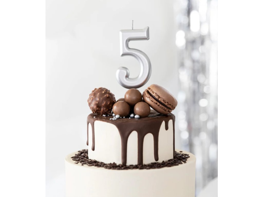Elegantní narozeninová svíčka ve tvaru čísla 5 v jemném stříbrném odstínu dodá vaší oslavě šmrnc a slavnostní nádech.