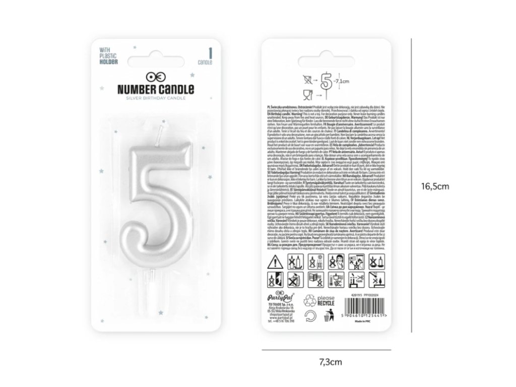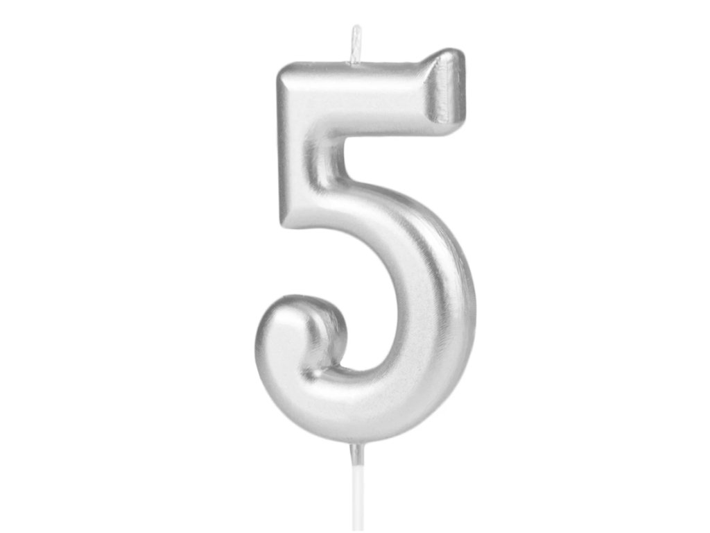Svíčka ve tvaru čísla "5" ve stříbrné barvě. Celková výška cca 10cm, výška samotného čísla je 7,1cm, plastový zápich má cca 2,5cm. Šířka čísla cca 4cm.