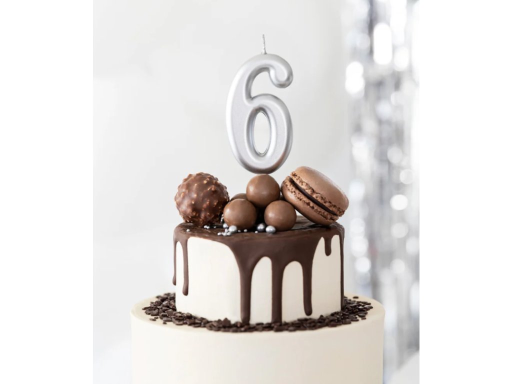 Elegantní narozeninová svíčka ve tvaru čísla 6 v jemném stříbrném odstínu dodá vaší oslavě šmrnc a slavnostní nádech.