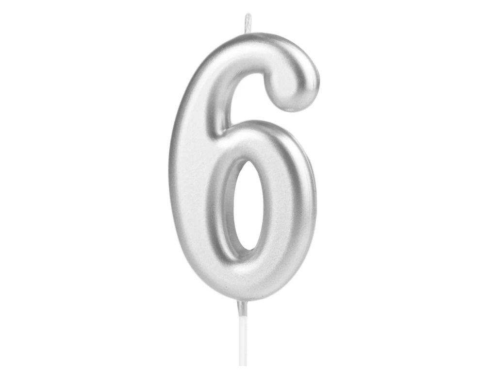 Svíčka ve tvaru čísla "6" ve stříbrné barvě. Celková výška cca 10cm, výška samotného čísla je 7,1cm, plastový zápich má cca 2,5cm. Šířka čísla cca 4cm.