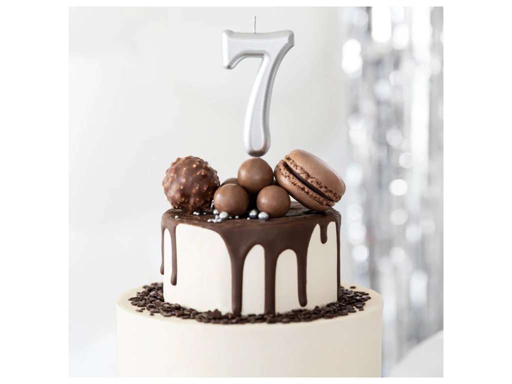 Elegantní narozeninová svíčka ve tvaru čísla 7 v jemném stříbrném odstínu dodá vaší oslavě šmrnc a slavnostní nádech.