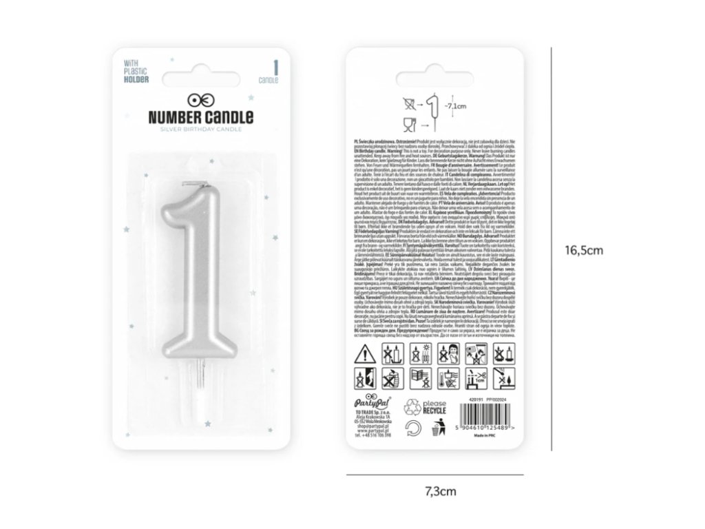Je vysoká 7,1 cm (s knotem až 8 cm), široká přibližně 4 cm a díky praktickému plastovému zápichu o délce 2,5 cm ji snadno umístíte na dort či zákusky.