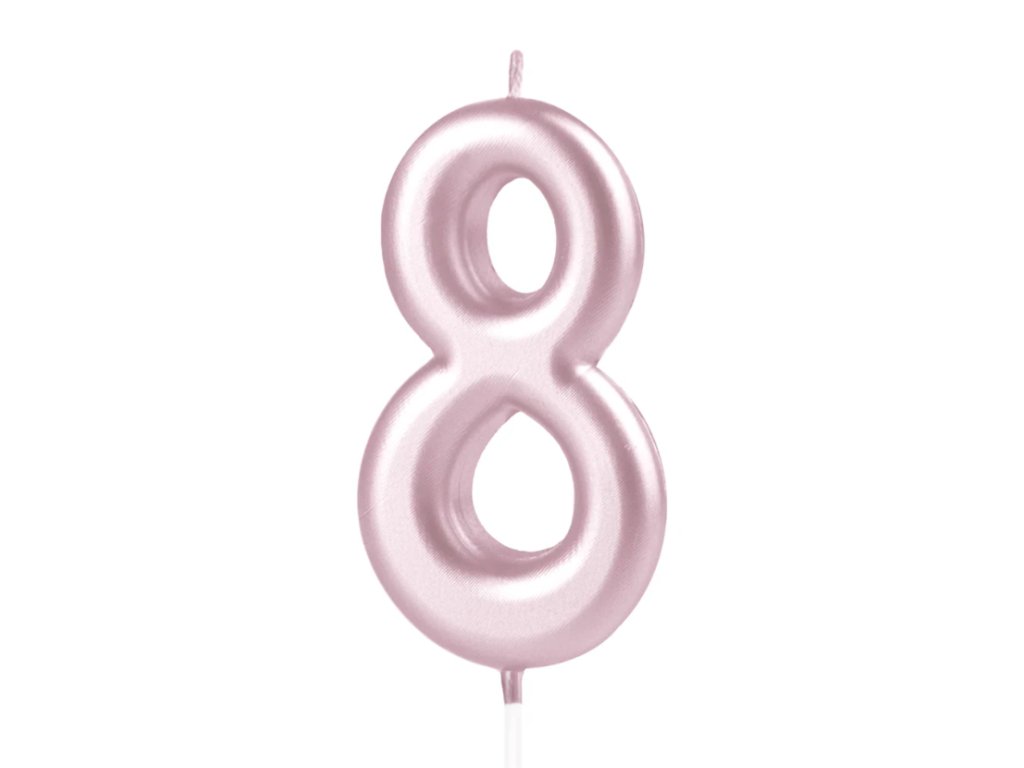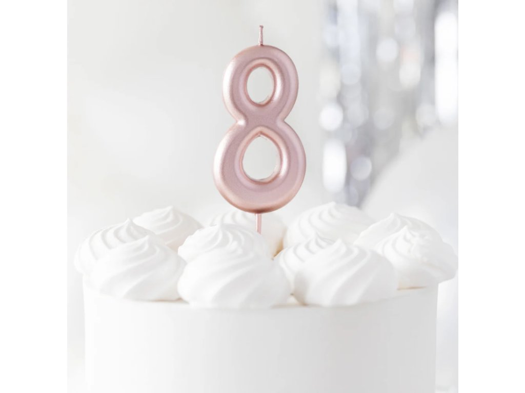 Elegantní narozeninová svíčka ve tvaru čísla 8 v jemném růžově zlatém odstínu dodá vašemu dortu šmrnc a slavnostní atmosféru.