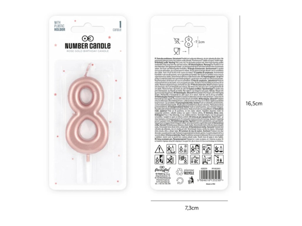 Svíčka ve tvaru čísla "8" v jemné růžově zlaté barvě. Celková výška se zápichem i knotem je cca 10cm, výška samotného čísla cca 7cm, plastový zápich má cca 2,5cm. Šířka čísla cca 4cm.