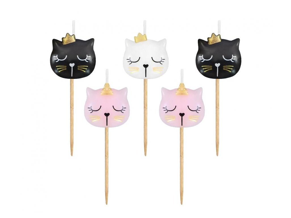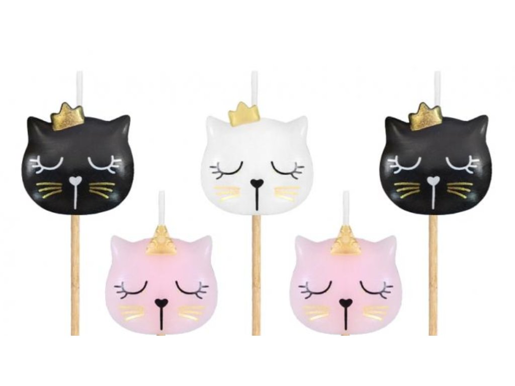 Dortové svíčky ve tvaru kočiček se zlatými korunkami, dvě růžové, dvě černé a jedna bílá. Velikost svíček je cca 3cm a v balení je 5ks. Dřevěný zápich 4cm.