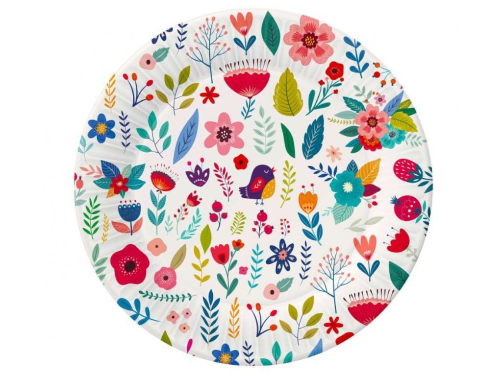 Nádherné papírové talířky s barevným květinovým motivem a roztomilým ptáčkem na čistě bílém pozadí. Ideální pro jarní oslavy, narozeniny nebo přírodní tematické párty.