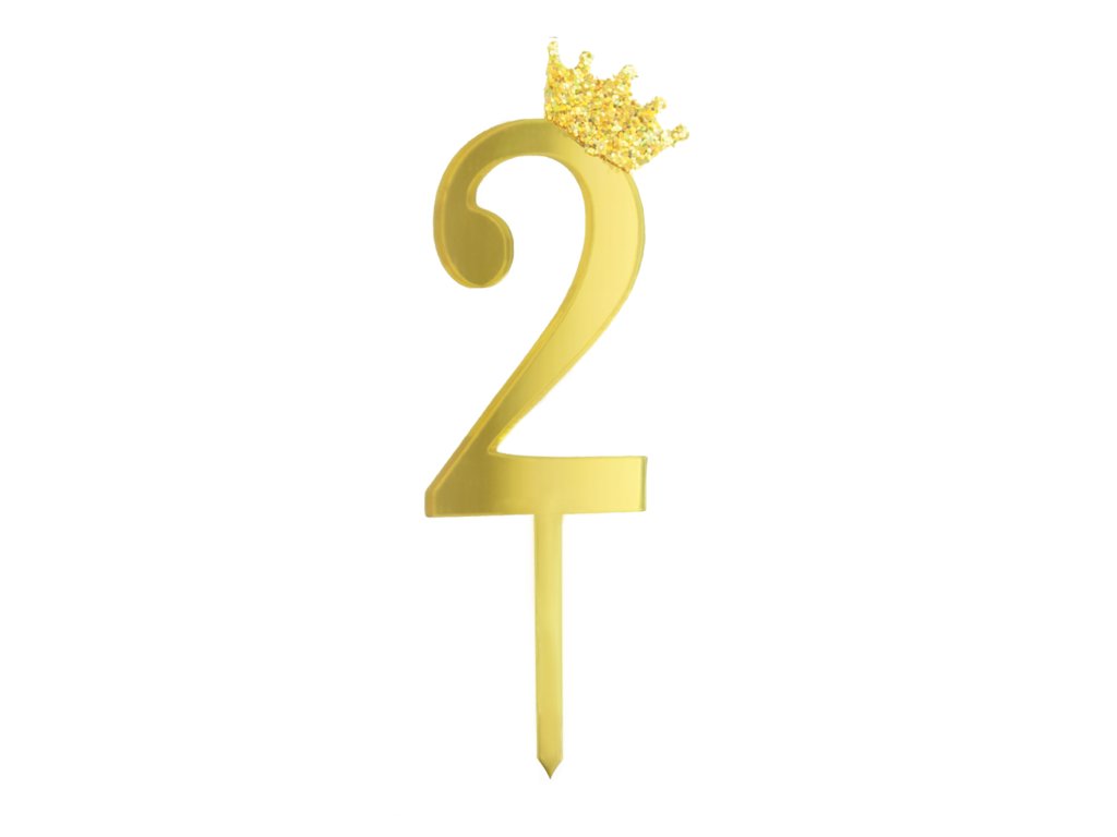 Elegantní dortová ozdoba ve tvaru čísla 2 ve zlaté barvě, doplněná zlatou královskou korunkou. Skvělá volba pro narozeninové dorty, výročí nebo tematické oslavy. Výška: 11cm, materiál: plast, balení: 1ks.